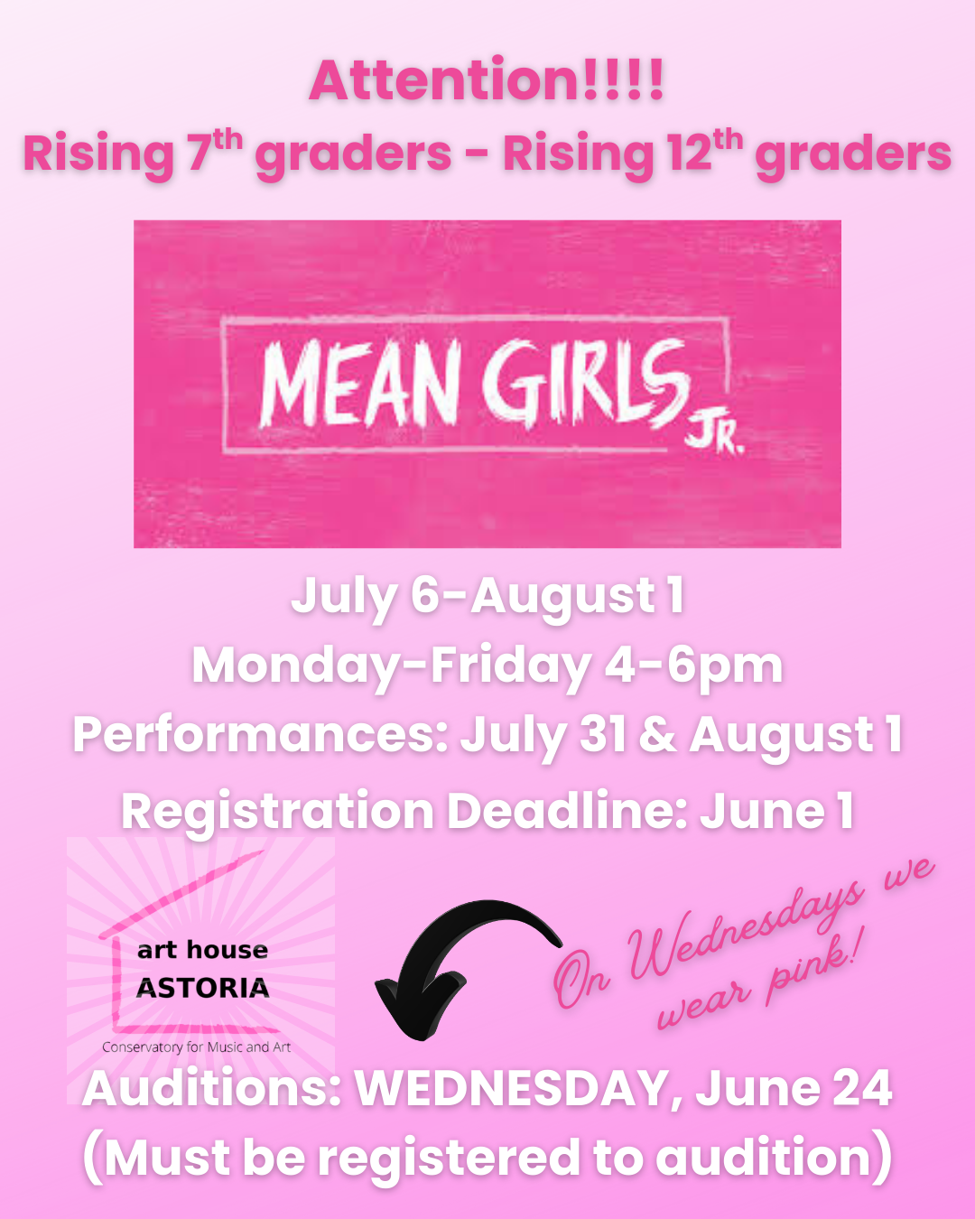 Auditions will be held Wednesday, June 24. Registration is required to audition, and all students who register will be cast.